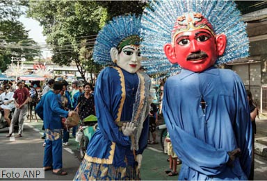 Bedelende reuzenfiguren zijn een aantasting van de tradities en cultuur van de oorspronkelijke bewoners van Jakarta, de Betawi. Maar een verbod maakt de arme Ondel-ondel brodeloos. ‘We hebben niet echt een andere keus.’