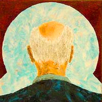 Zichzelf schilderde hij realistisch, maar wat mij trof was de achtergrond op zijn schilderij.