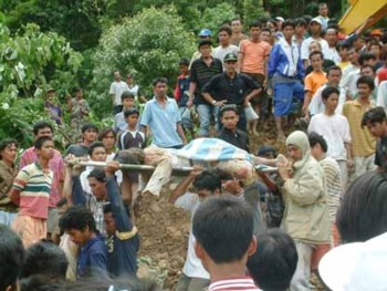 Search and rescue workers carry the body of a victim of a landslide in Gaung, West Sumatra. At least 10 people were killed in the disaster that was triggered by heavy rain on Friday.