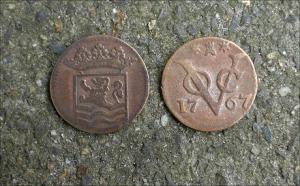Twee verweerde munten met aan de ene kant het wapen van Zeeland en aan de andere zijde het logo van de Verenigde Oost-Indische Compagnie (VOC). Geslagen in Middelburg, verscheept naar Indi en na ruim tweehonderd jaar weer terug in Zeeland.