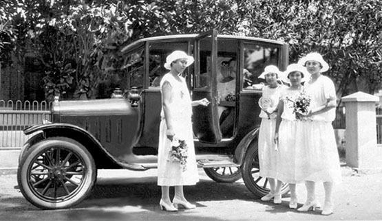 … van de bruiloft van mijn Tante Lily met Oom Ab, in die prachtige auto. Tante Lily was de oudste zus van mijn moeder, Plantersvrouw Harriet Marsman, waarover al e.e.a.     op deze site staat.