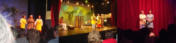 Wij hadden de voorstelling “de drie tantes” van Wieteke van Dort, Esther Scheldwacht en Nel Lekatompessy bijgewoond. Zij zijn de tantes Lien, Grace en Pang, resp. uit Ned Indi, Amerika en Ambon. De tantes, n nichtje Ramona (die geen rijst lust)  bereiden de 80ste verjaardag voor, van oma Babes, die destijds in het contractpension iedereen voorzag van lekker indisch eten. Natuurlijk weer veel herkenbare zaken, hilarische situaties, vooral de wat ondeugende schuine mopjes vielen in goede aarde. Tussen de regels door, wordt verteld over de moeilijke tijd in de pensions, emigratie naar ’t buitenland, de Molukse samenleving in Ned. (uitleg over PELA)