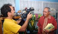 Foto van de filmopnames. Leonard Retel Helmrich filmt Rene Creutzburg die in Amerika al tientallen jaren het blad ‘de Indo’ maakt