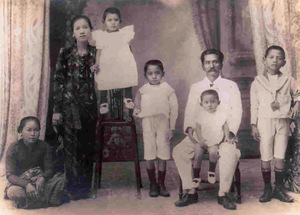 1911: Johannes Augustinus Diederik met zijn tweede vrouw Dhajitosari, de pleegmoeder van zijn kinderen. De oudste zoon was Diederik, helemaal rechts op de foto. Hij kwam om in het jappenkamp Haroekoe. Het meisje is  Moesje (Sophia Madelaine Angeline), overleden in 1950.  Ze huwde Nasso Willem Deuning die de birmaspoorweg niet overleefde. Sinds 1939 had ze de zorg voor 3 kinderen van haar jongste broer Roger, die bij zijn vader zit.    Haar foto, gemaakt voor de Japanse ‘administratie’ :