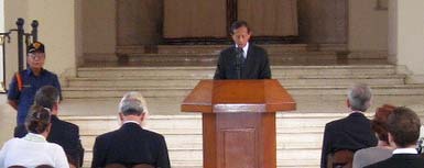 Zo aanstonds zal ambassadeur Van Dam namens het Koninkrijk der Nederlanden de eerste krans leggen, gevolgd door de adjunct-defensieattach, luitenant-kolonel Bouwmeester, die een krans zal leggen namens het ministerie van defensie. Vervolgens zal de assistent-defensieattach, adjudant Rameckers, een krans leggen namens de Stichting Herdenking 15 augustus 1945.
