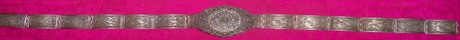 Jouw ceintuur komt van het eiland Sumatra, hoogstwaarchijnlijk uit de stad Palembang. Het is zogenaamd Straits Chinese Silver, dus afkomstig van de kusten van de Straat van Malakka en gemaakt door Chinese of Indo-Chinese zilversmeden. Deze Peranakan Chinezen wonen al generaties lang(soms al sinds de 14de eeuw) in deze kustplaatsen en leven vnl. van handel en kunstnijverheid. Hun edelsmeedkunst is voor de eigen Chinese bevolking, maar ook geliefd bij de inheemse aristocratie. Het maakt onderdeel uit van hun feestelijke & ceremonile dracht en is zeker niet speciaal gemaakt voor de dans.