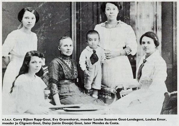 Ik ben bezig met het uitzoeken van de stamboom van de familie Jeanty uit Soerakarta. Aangehecht is een foto uit 1900 van een gedeelte van de familie, nog in de rouw een jaar na het overlijden van moeder Johanna Catharina Jeanty-Landegent. Behalve naar informatie over de ouders van Louis Joseph Jeanty, eventuele broers en zussen van zowel hem als zijn vrouw, en informatie over de kinderen die verder gaat dan alleen geboortedatum/plaats en datum/plaats van overlijden, zoek ik ook fotos van de hele familie (ze hadden ten minste 11 kinderen). De aangehechte foto is de enige van de familie die in mijn bezit is. Tevens aangehecht is een foto die ik bij toeval in het archief van de TongTong (of was het toen al Moesson) van 1992 aantrof. De daar genoemde Louise Suzanne Gout-Lendegent heet in werkelijkheid Gout-Jeanty en was een van de dochters van Louis Joseph en Johanna Catharina. Mijn oma Adèle Jacqueline Hermine (overleden juni 1961) was een van haar zussen. Ik weet niet wie die foto in bezit heeft, aangezien de heer Armand Mendes da Costa (de schrijver van het artikel in de Moesson en waarschijnlijk ook de eigenaar van de foto) vorig jaar overleden is.