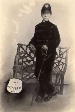 Tja … wie zou deze piepjonge “koloniaal” nog kennen? Zo te zien aan zijn donkere Europese (en dus niet witte “tropen”)kloffie en aan het bordje “Tot wederziens 1894” nog niet echt “bij” het KNIL, maar aan de vooravond van zijn vertrek naar Indi, waarschijnlijk uit het depot voor kolonialen in Nijmegen of Harderwijk. “Nou tabe dan …..”