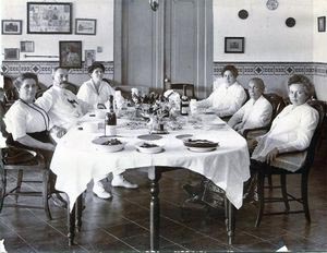 quote mail: Deze foto geeft een bezoek weer van mevrouw Anna Maria Cortiana van Rijn-Kraag samen met haar twee oudste dochters aan een mij onbekend echtpaar en waarschijnlijk hun dochter. Links op de foto het echtpaar met mogelijk hun dochter. Rechts op de foto achteraan Marie (Maria Josephina *01-01-1870 Djokjakarta+22-12-1927 Den Haag) van Rijn. In het midden Anna Maria Cortiana van Rijn-Kraag (*03-05-1847 Djokjakarta+20-04-1921 Djokjakarta). Vooraan Anna (Anna Maria Suzanna *11-04-1868 Palembang+na 1932 Den Haag?) van Rijn, gehuwd met Gerbert Rebel (*09-04-1846 Almen+15-02-1916 Den Haag). Vermoedelijk is de foto gemaakt na het overlijden van Johannes Hendrik van Rijn (*13-08-1838 Alphen;Gelderland +18-11-1910 Djokjakarta) en wellicht na het overlijden van Gerbert Rebel. Dus tussen 1910 en 1921 of tussen 1916 en 1920. Ik hoop, dat iemand mij verder op weg kan helpen. Bij voorbaat dank. Met vriendelijke groet, Ad Dijkhoff