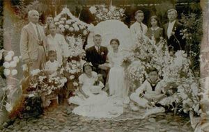 quote mail: Huwelijk Dusseljee in Salatiga 6 december 1939 in de tuin van het huis.v.l.n.r.* mijn opa Hendrikus Wallenburg, werkzaam bij de Nederlandsche PTT als telefoon-monteur.* mijn oma Twie Nio, in verwachting van mijn oom Theo.* tussen hen in oom Ben.* achter hen een getuige van mijn vader.* het echtpaar bestaande uit Hendrikus Dusseljee en mijn moeder Jetje Wallenburg.* voor hen op de grond, tante Pop en oom Johan.* achter hen oom Joes en getuigen van mijn moeder.