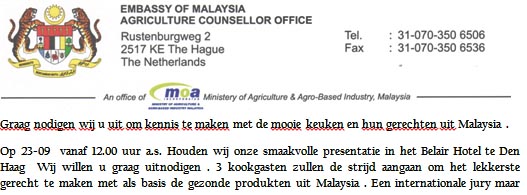 The Embassy of Malaysia is pleased to announce the upcoming Malaysia Week from 18 to 24 September 2011 in The Hague. Lees verder