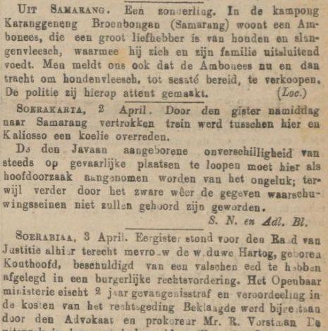 Die artikelen uit oude Indische kranten geven een mooie inkijk in wat toen nieuwswaarde had en hoe het nieuws werd gebracht. Bescherming van privacy (van die arme weduwe Hartog) en politieke correctheid (de den Javaan aangeboren onverschilligheid ……) waren nog geen “issue” in die samenleving.