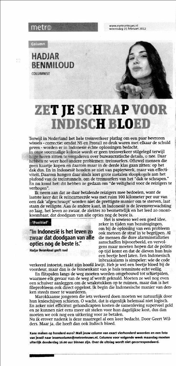 De laatste opmerking van het meisje Benhuppelepup, Metro columniste, over het Indische bloed van Wilders was mij niet eens als discriminerend opgevallen, totdat andere geachte schrijvers op dit blog zich gingen roeren. Dat heeft mij ertoe bewogen te reageren op het artikeltje zoals ik heb gereageerd. Spottend, sussend, relativerend. Laat zo’n meisje toch. Haar woorden vervliegen als windjes in de storm. Net als de mijne trouwens.