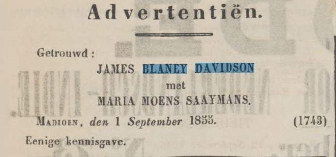 quote mail:  Ik kan iedereen de website: “historische kranten” van de koninklijke bibliotheek aanraden. Er zijn Nederlandsch Indische kranten op te vinden en die gaan ver terug. Ik vond er de volgende familie advertentie terug uit 1855 waarin het huwelijk van mij overgrootvader en -moeder werd geplaatst.