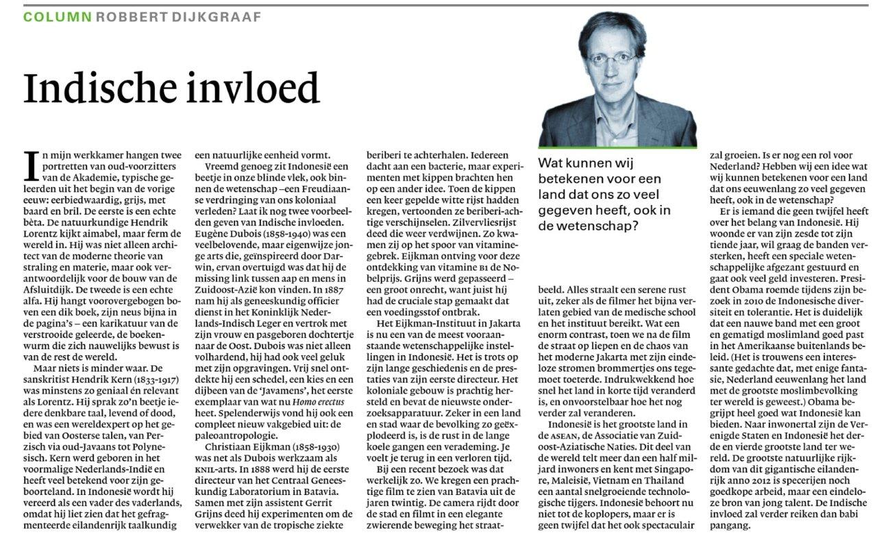 Jammer dat de discussie zo off-topic gaat. Dijkgraaf is in Nederland nu de meest bekende man in wetenschappelijke kringen en heeft ervan genoten in Indonesië gast te mogen zijn in Instituten van zijn niveau. Toen ik nog werkte genoot ik ook van discussies met Indonesische collega’s. Daar kwamen geen koloniale problemen aan te pas. Dat interesseerde de gesprekspartners niet.