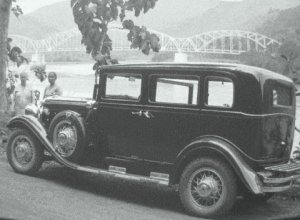 Het is 1931 en daar staat de acht cylinder Hudson met op de achtergrond de brug over de Kali Serayu (Serajoe). De brug staat er nog steeds.