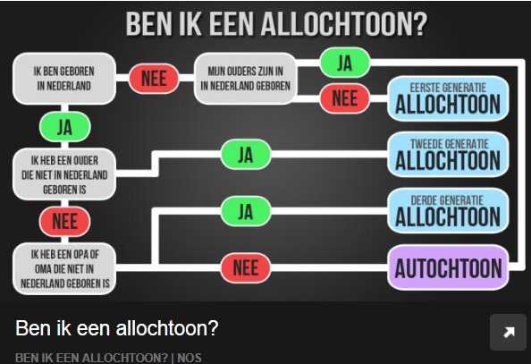 Ooit zei men ‘buitenlander”. Maar toen daar teveel negatieve emoties aan hingen, stapte de samenleving over  naar allochtoon. Als men bedoelt met “allochtoon” …. met  een nabije buitenlandse afkomst, dan heb ik er geen bezwaar tegen om mij zo te noemen. Maar er bestaat ook een veel gebruikte uitleg dat het buitenlander betekent . En dan veer ik op. Ik ben geen buitenlander. Mijn ouders ook niet. Die werden al vervolgd damals omdat men buitenlander was, familie en vrienden van hen stierven omdat ze Nederlander waren. Helaas gebruikt het statistiekenbureau van de overheid, het CBS, dat woord allochtoon ook in die dubbele betekenis. CBS-rapporteurs brengen hun tabelletjes uit met toevoegingen van “Indonesiërs” als men het heeft over de groep in Indonesië geboren en hun kinderen. Noem die groep toch Indonesiëgeborenen. Daarmee geeft men direct aan dat er een reden is om etiketje Indonesiërs niet te gebruiken. Het schemaatje hierboven is van een NOS-site. Men gaat uit van de CBS-definities van allochtoon. Maar het CBS stelt: Iedereen met maar 1 ouder geboren in Nederland is 2e generatie allochtoon.Een 3e generatie bestaat niet in het CBS-wereldje.