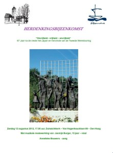 De samenkomst wordt georganiseerd in samenwerking met het Voorbereidingscomité 15 augustus Herdenking van de Duinzichtkerk-Vredeskapel. Zij vindt plaats op zondag 12 augustus 2012 om 17.00 uur in de Duinzichtkerk, van Hogenhoucklaan 89, 2596 TC Den Haag. Jasmijn Burger gaat het 2e gedeelte van het vioolconcert van Mendelssohn spelen, een kampgeschiedenis uit het mannenkamp Tjimahi.