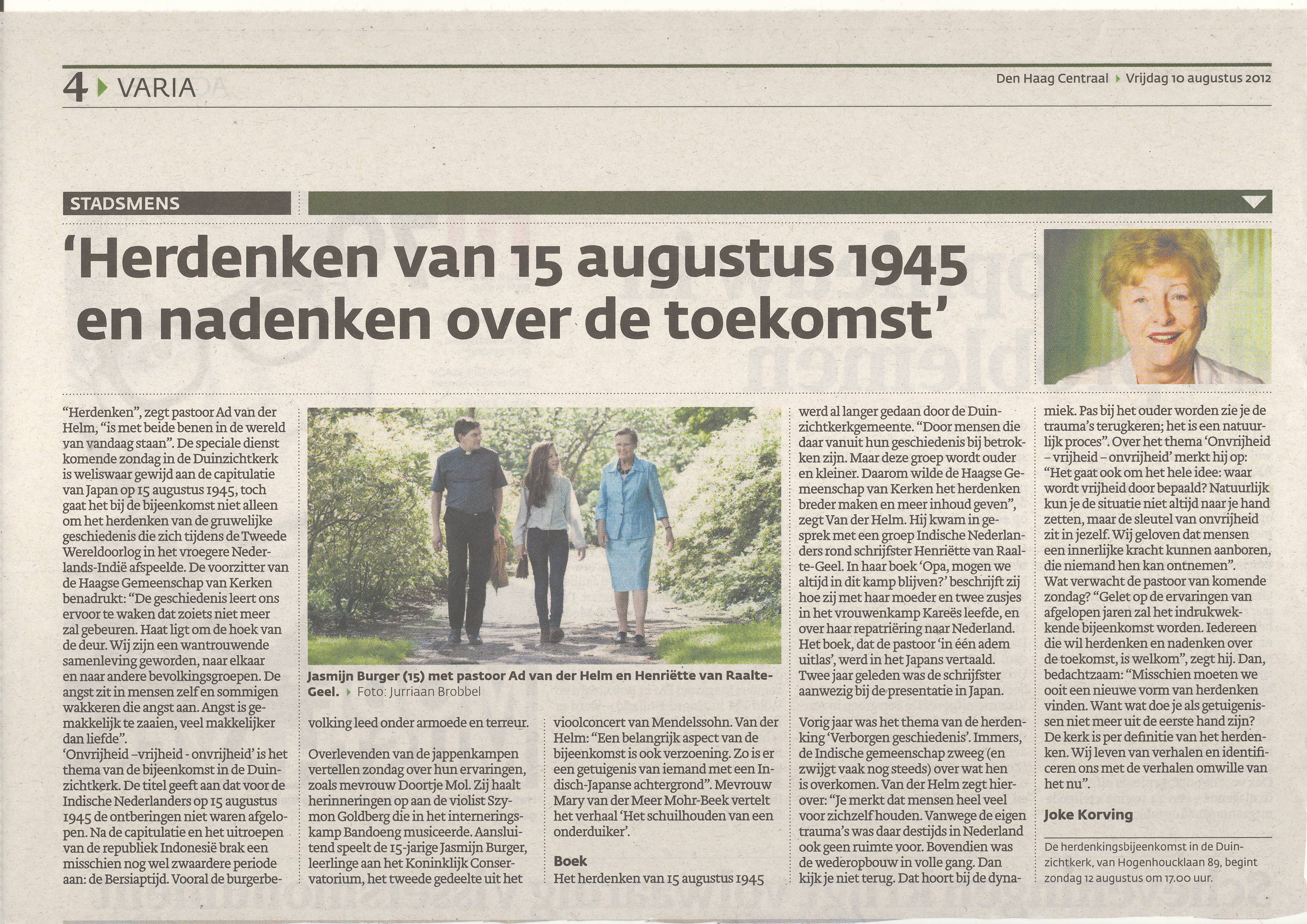 Klik op afbeelding, artikel interview Pastoor vd Helm —- De samenkomst wordt georganiseerd in samenwerking met het Voorbereidingscomité 15 augustus Herdenking van de Duinzichtkerk-Vredeskapel. Zij vindt plaats op zondag 12 augustus 2012 om 17.00 uur in de Duinzichtkerk, van Hogenhoucklaan 89, 2596 TC Den Haag. Jasmijn Burger gaat het 2e gedeelte van het vioolconcert van Mendelssohn spelen, een kampgeschiedenis uit het mannenkamp Tjimahi.