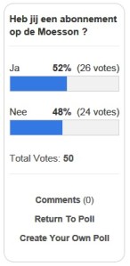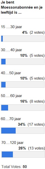 Weinig representatief natuurlijk, met 26 abonnee´s. Als het beeld klopt – en daar zullen ze bij Moesson niet van opkijken – dat moet je constateren dat het lezerspubliek op leeftijd is: 76% 50+, en 60% zelfs 60+. Ondanks alle pogingen het blad te verjongen.