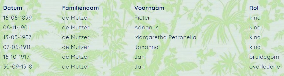 Ik ben Monique de Mutzer, wat leuk om te zien dat jullie een stuk van mijn heritage hebben uitgezocht. Ik beschik over originele documenten van de familielijn De Mutzer, waaruit het e.e.a. blijkt. Tot op heden heb ik niemand kunnen vinden die de familienaam De Mutzer draagt. Adrianus was mijn opa van vader’s kant.