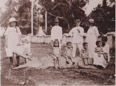 Uit mijn moeders fotoverzameling. Van links naar rechts, zittend op de krokodil: Hertha Berger. Achter haar staat Herman Berger, mijn grootvader. De twee kleintjes in hansop, zittend op de krokodil, de tweeling Eddy en Lody Berger, broers van mijn moeder. Wie de anderen zijn weet ik niet. De vrouw met het kind op schoot is waarschijnlijk de eerste vrouw van Herman Berger. Mijn grootmoeder dus.    Bron