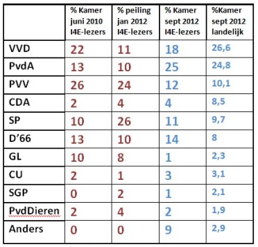 Maar aan wie hebben VVD en PVV hun I4E-stemmers verloren, als CDA, SGP, CU, SP en D’66 ongeveer gelijk bleven tov 2010. Dat moet vooral PvdA en de categorie Anders zijn die nu ineens verschijnt met 9%.  Het zou me niet verbazen als 2/3de daarvan , dus 6 zetels,  gingen naar de 50+, de ouderenpartij.