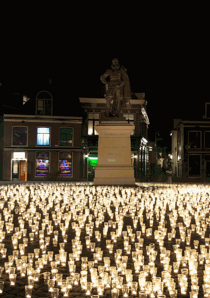 Zij deden dit door op uitnodiging van Comité 7 mei brandende kaarsjes bij het beeld van J.P. Coen te plaatsen.