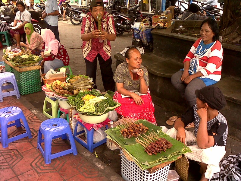 Wachten op klandizie en dus wachten op de Rupiahs en intussen maar de tijd doden met je buurvrouw of een buurman die toevallig een gekke bui heeft en de lolbroek probeert uit te hangen omdat er een camera in de buurt is. Sate, kangkung, ketupat, bami…. kwijl kwijl ondanks de straatbacteriën.