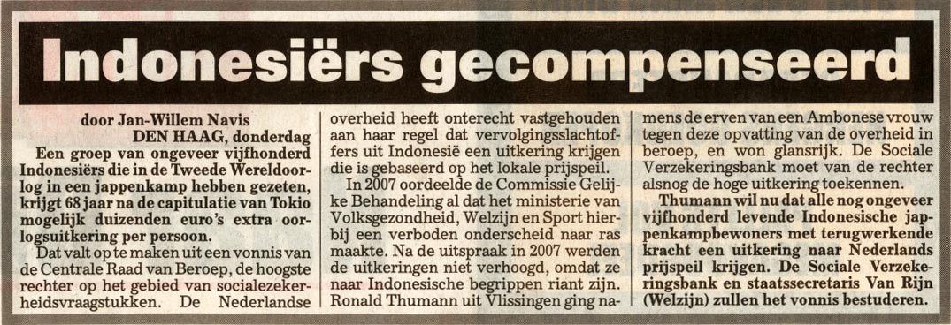 Het krantenartikel geeft aan dat het om een Ambonese vrouw gaat maar dat kan je ook uit de naam afleiden. Ik denk dat zij vanwege haar man dhr Latuparisa, die waarschijnlijk in de KNIL gediend heeft, zodoende in het kamp terecht kwam. Aangezien zij in 2011 gestorven is hebben haar erven een aanvraag ingediend. Dhr.Thumann treedt in de zaak op als appellant/rechtvertegenwoordiger. Hij zal na de zaak ook een aanvraag indienen voor 500 (Indonesische) overlevenden van de kampen of hun rechtsopvolgers . Meneer Thumann zet U maar lekker door.