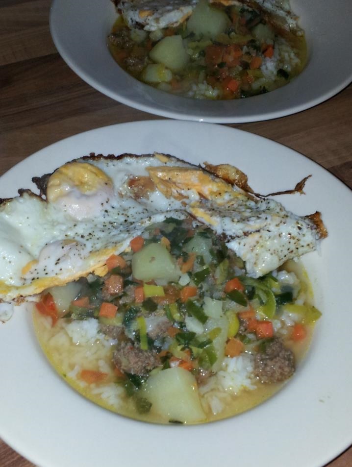 Gewoon een simpele groentesoep, met rijst en telor ceplok( spiegeleitje)….kep de balletjes wel heel pittig gemaakt met rawitjes dr in knoflook uitje en beetje trassie, peper zout citroen, kecap…erg lekker, voor mij dan he….hahaha….morgen bij pec- Feijenoord zal het nog lekkerder smaken en….heel de pan voor mij, dr komt toch niemand…ik vermaak me t weekend wel….nu naar een feessie toe…Fijn weekend allemaal…XX