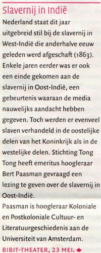 Op 23 mei op de Tong Tong Fair gaat Bert Paasman vertellen dat het aantal slaventransacties in den Oost ( VOC-gebieden) evenveel was als in den West (Caraïben) Hij zal bedoelen wat onder Nederlands verantwoordelijkheid viel.