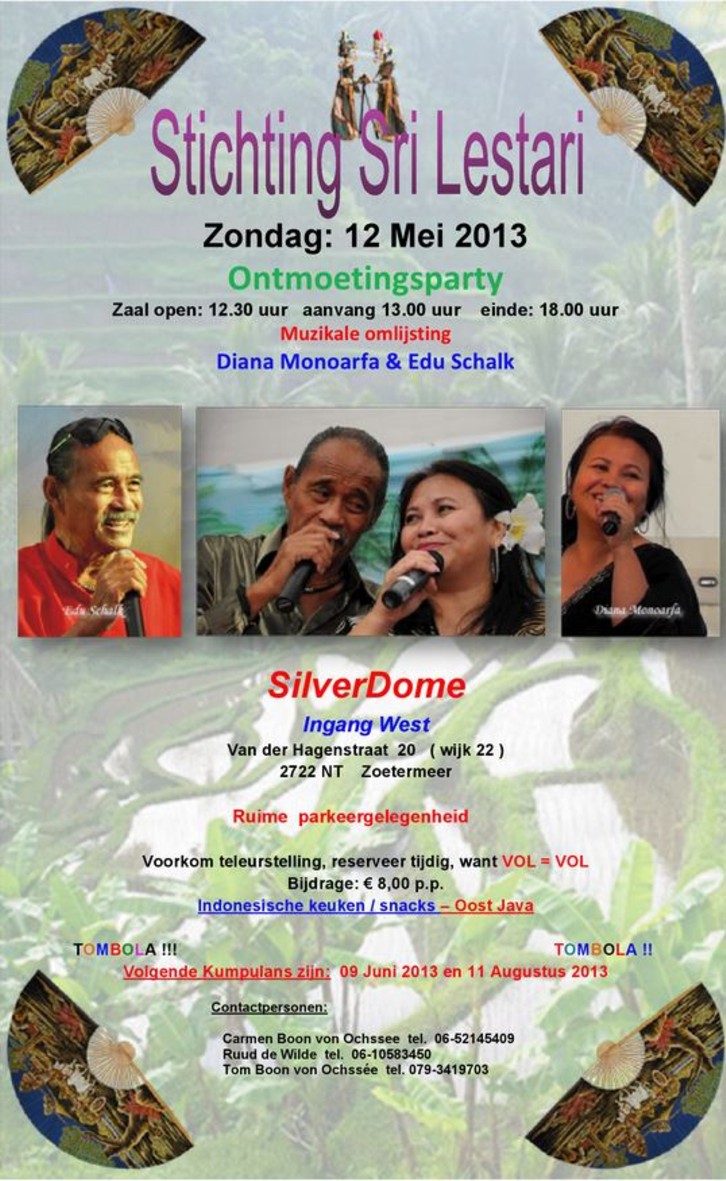 Morgen, zondag 12 mei, is het moederdag. De weersvoorspellingen zijn niet al te best dus….trakteer je moeder, of jezelf op een leuke kumpulan in de Silverdome te Zoetermeer met optreden van niemand minder dan Mr Entertainer Edu Schalk samen met Diana Monoarfa.