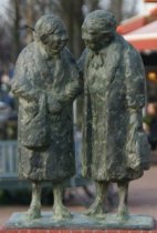 Nu dat deze tantes op het standbeeld hun hoeden werkelijk nodig hebben tegen de bommen van vogels hebben ze hun hoed vergeten.