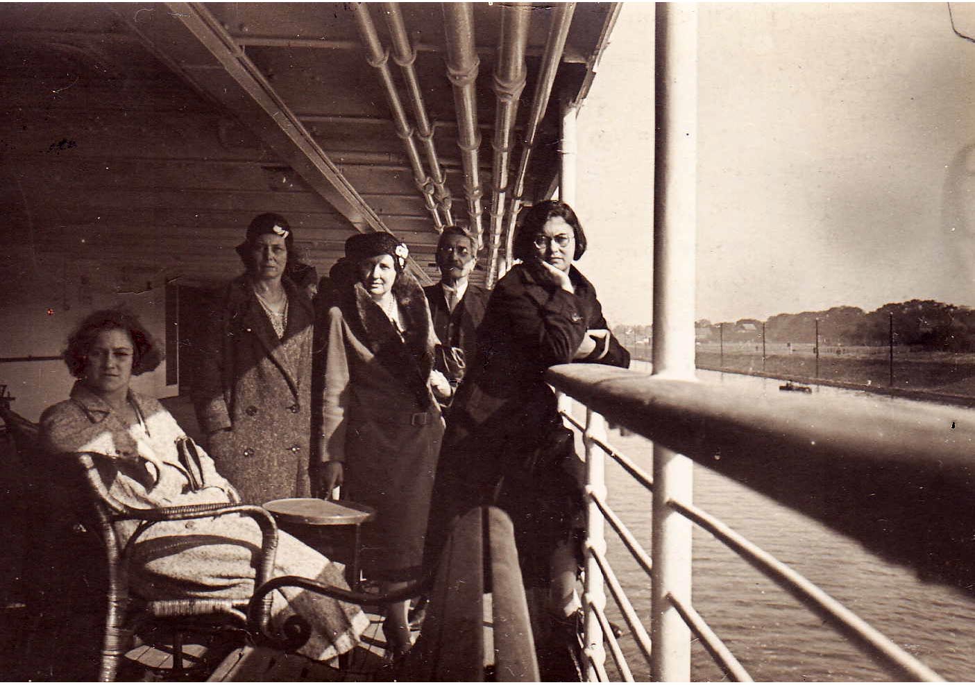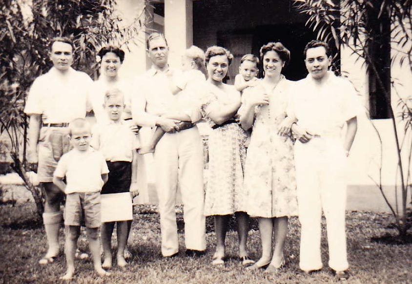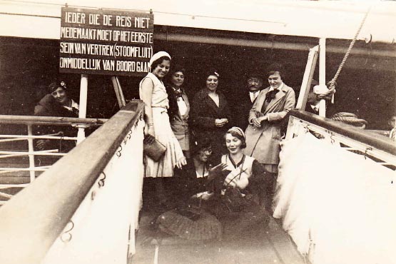 Links staat Johanna met haar man Emmerich Pillis ( zoon van Pillis-Reijneke). Zij huwden in deze maand. De twee jongetjes voor hun, zijn kinderen van Pauline, de zuster die in het midden staat, rechts van haar man Flip van der Wees, die hun derde kind draagt. Dit werd de laatste foto van Flip. Hij was werkzaam bij de BP Mij te Balikpapan en een jaar later werd hij daar vermoord door het Japanse leger. Zie ook dit linkje