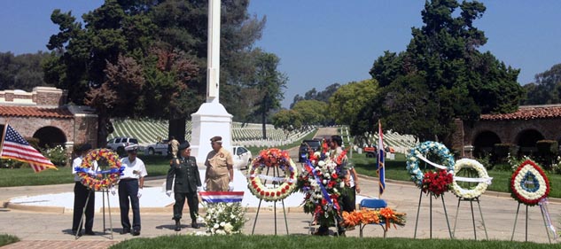 This year’s annual memorial ceremony was presented once again by the ‘Comité 15 augustus 1945′ under the auspices of the Nederlandse Veteranen Vereniging Wapenbroeders USA. Last Saturday, August 10, 2013, a group of about 50 people came together at the Los Angeles National Cemetery