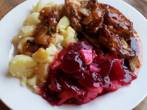 rooie bietjes met kipkluiffies in een pittige sjuu, met aardappelen natuurlijk…en wie zegt maar steeds dat ik allochtoon ben (FB)