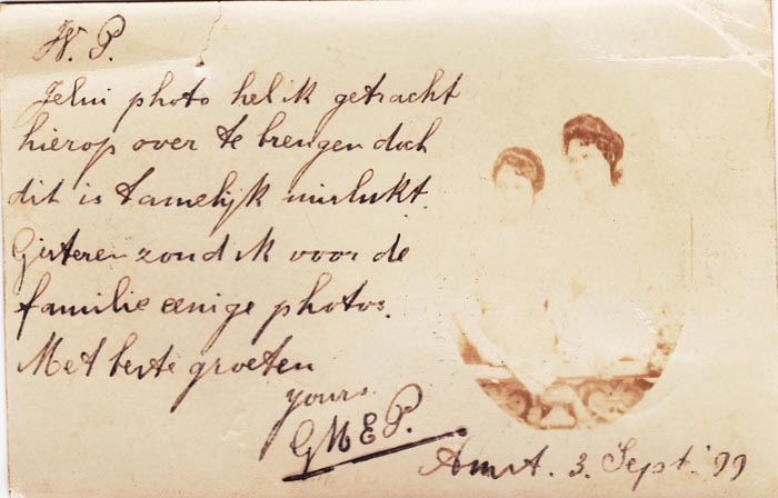 Foto van Briefkaart van 2 dames. De vraag hierbij is of iemand de initialen kent van de zender. Vaststaand feit: Hij was officier gelegerd in de kazerne te Amersfoort, maar nog in opleiding. De dames op de foto zijn (99% zekerheid) Constance Pauline Boelen en Pauline Constance Boelen van links naar rechts, 2 zussen