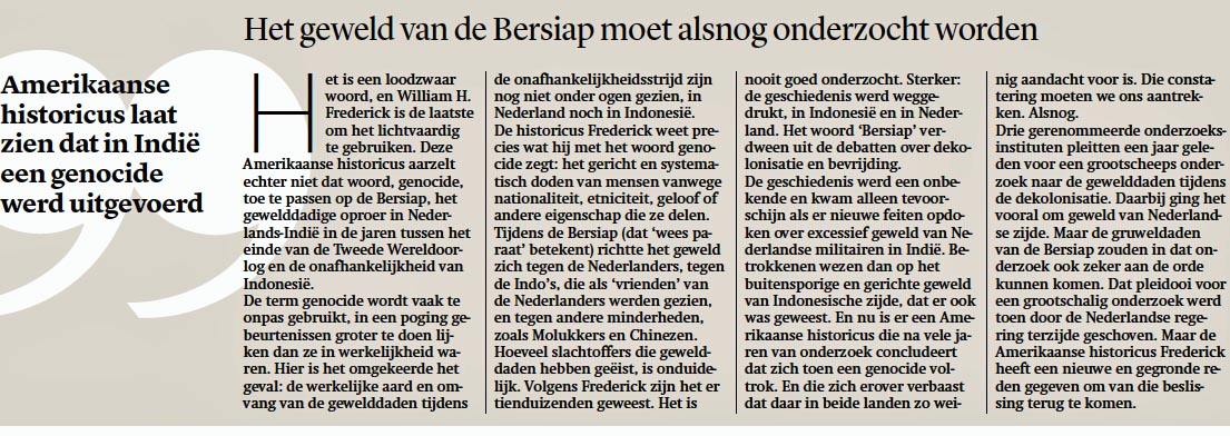 Wat ik trouwens mis in de commotie over het genocide interview is de mening van collega historici die zich met de Japanse tijd en dekolonisatie bezighouden. Ik zou bijvoorbeeld graag de mening van Bussemaker horen. Nu blijven die genocide opmerkingen van Frederick in het luchtledige hangen.