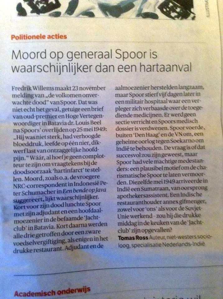 Tja, het blijft oon nu nog steeds allemaal bijzonder “verdacht”. Complottheorieën a la Thomas Ross zijn zo te bedenken. Zijn vrouw weerspreekt met klem dit verkaal in haar boek over Spoor “Achteraf kakelen de kippen”. Maar goed zij was er toen op dat moment ook niet bij en zat op de boot naar Nederland… Als we het allemaal eens wisten… (net als het Indisch onderkoningschap van Prins Bernhard). Misschien ook maar beter van niet.
