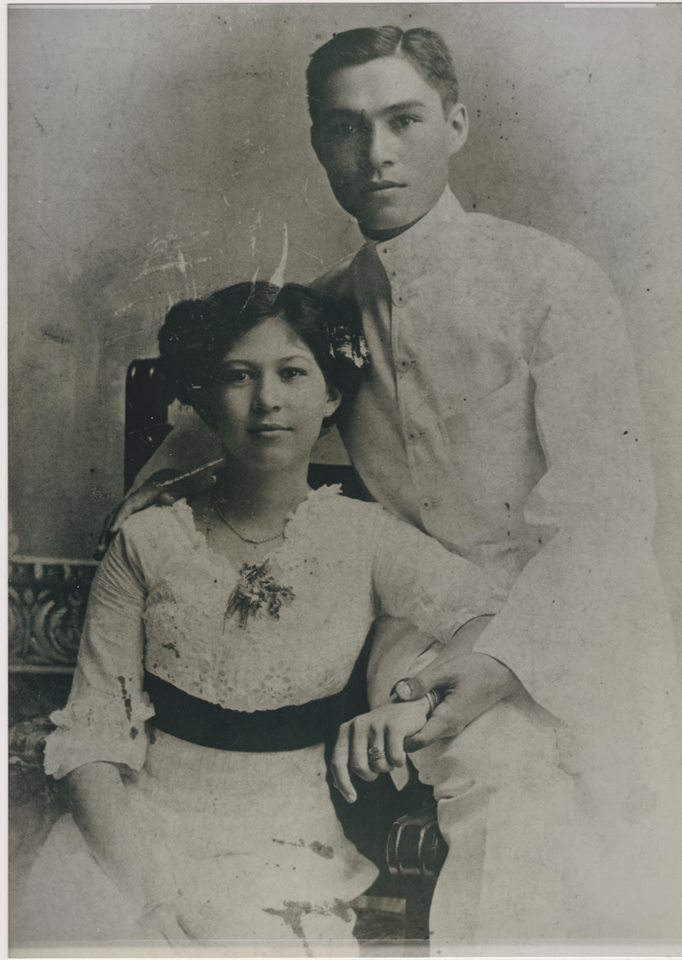 Voor welke gelegenheid werd de foto gemaakt? Vermoedelijk is het geen trouwfoto, alhoewel zij er op hun paasbest op stonden, hij in zijn jas toetoep, zij in prachtige japon en met iets in heur haar.