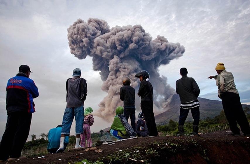 More than 25,000 people have evacuated their homes following a series of eruptions and lava flows from a volcano in Indonesia. Mount Sinabung, on the western island of Sumatra, sent hot rocks and ash up to 5000 metres in the air several times yesterday,