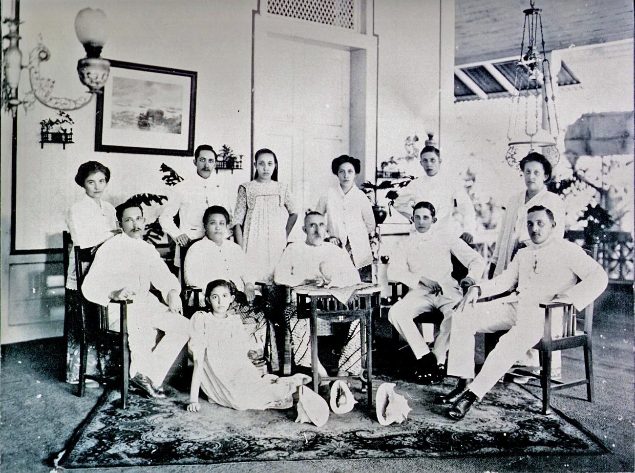 Het maken van een foto in die tijd moet een ernstige want niet alledaagse zaak zijn geweest. Toekang Poto met al z’n prabot thuis ontboden, stoelen en tafel keurig gearrangeerd in de voorgalerij, wat extra versiering aangebracht (let op de 3 grote schelpen op de voorgrond; het tapijt hoort waarschijnlijk ook tot het gelegenheidsdecor, want in welk Indisch huis was een tapijt?).