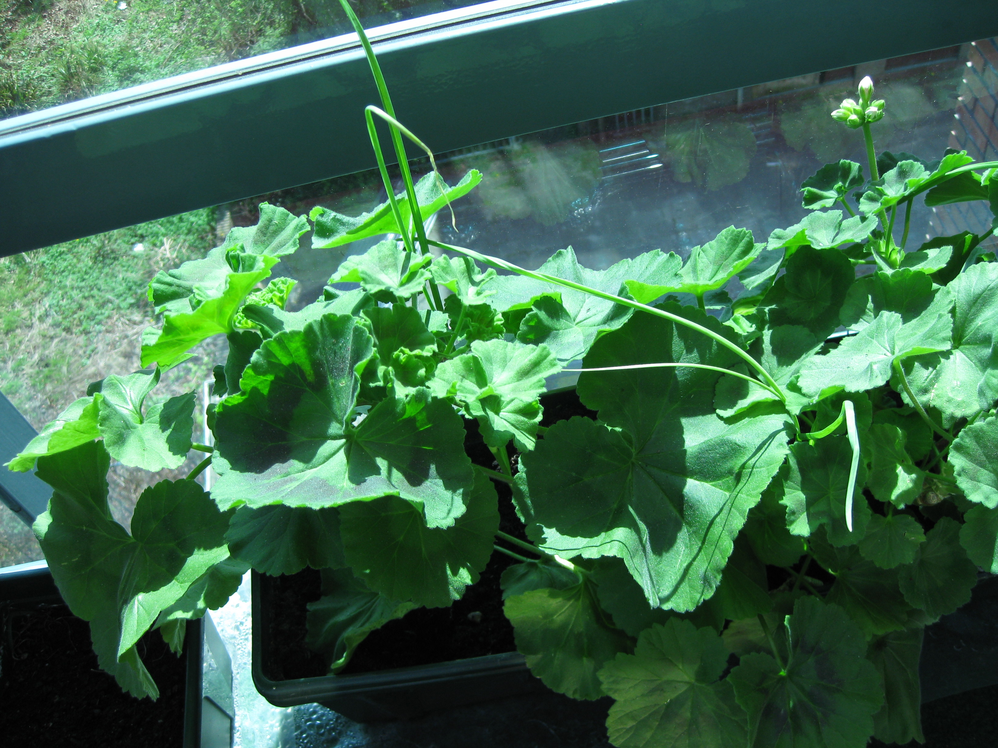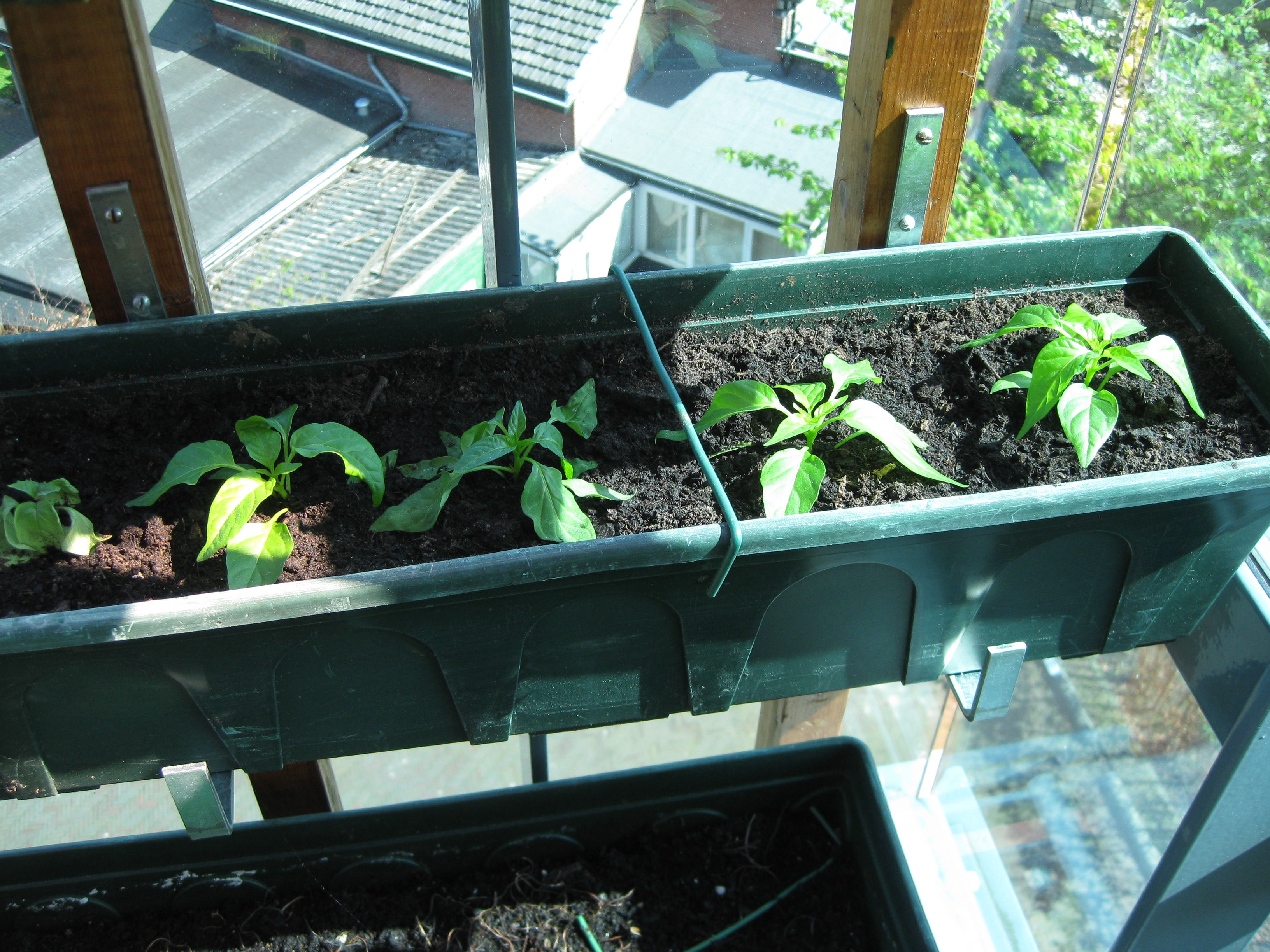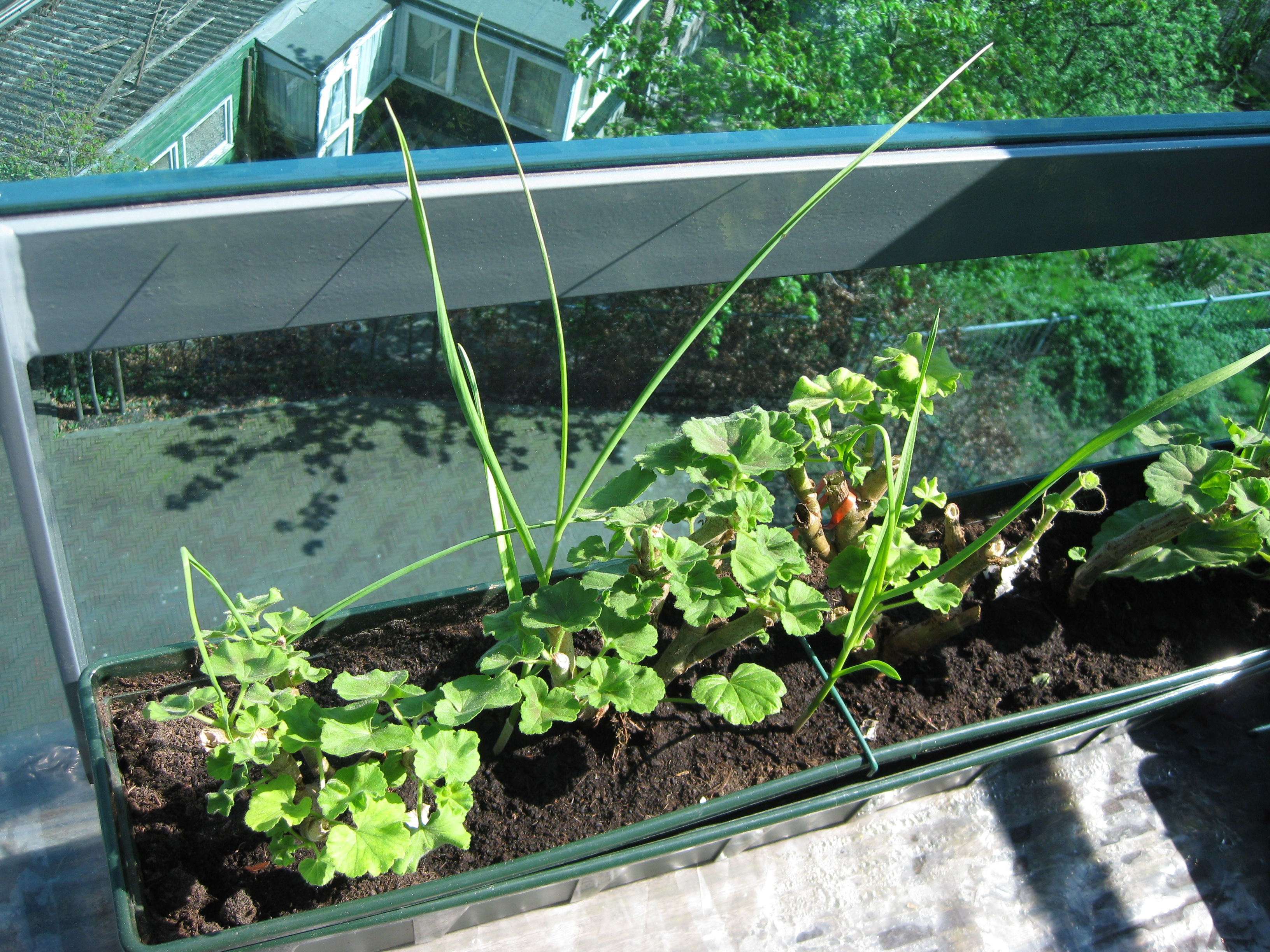 Hierbij wat plaatjes van jonge bawang poetih tussen de geraniums (tegen de luizen) en jonge lombok. Een beetje zielig nog, maar dat waren wij in dat stadium ook. Zie maar als je er wat mee kan doen. Zo niet, even goede vrienden.