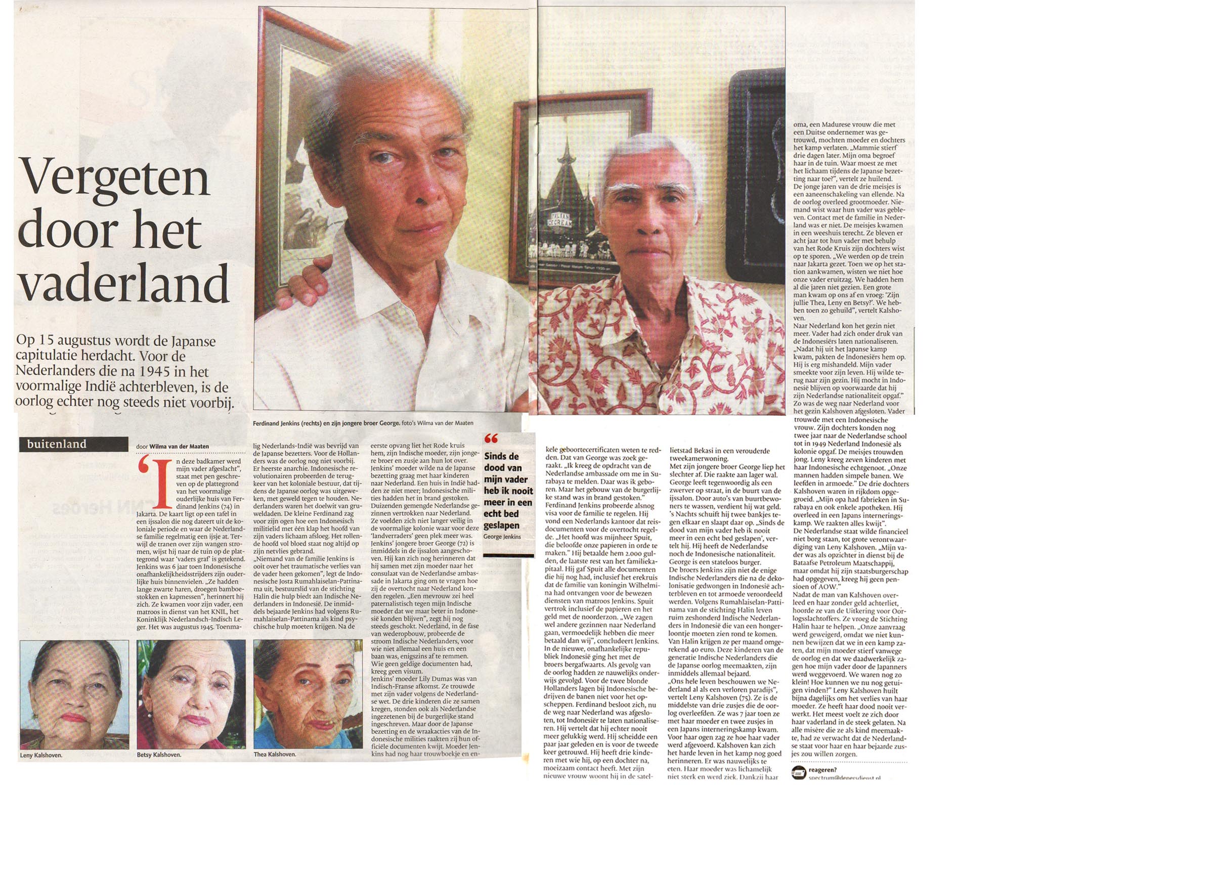 De zusjes Kalshoven hoopten na de onafhankelijkheid in 1945 met hun ouders terug te keren naar Nederland. Maar hun moeder stierf in het Jappenkamp. Waar hun vader was gebleven wisten ze niet. Familie was er niet meer dus kwamen ze in een weeshuis in Oost-Java terecht Holland Doc . artikel augustus 2013