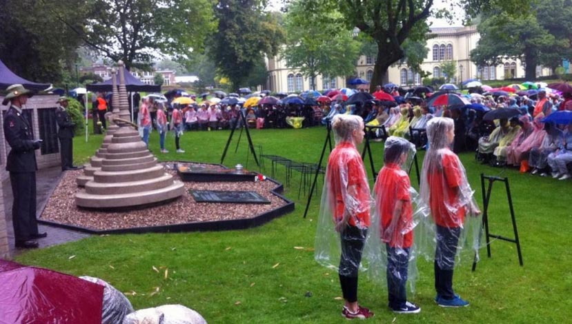 De jaarlijkse bijeenkomst had plaats in de tuin van het landgoed. De belangstellenden moesten flink wat regen trotseren
