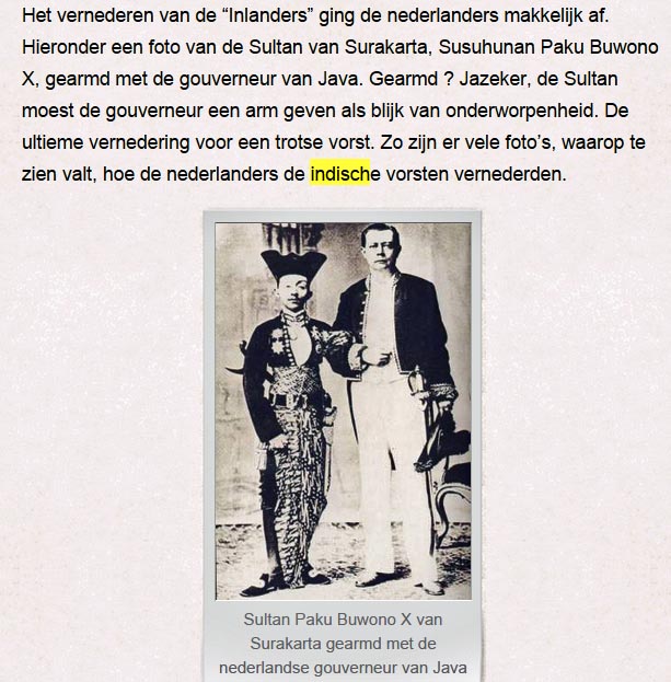 Ik ken die foto al jaren. Nooit aan vernedering door Nederland gedacht. Waarom niet? Ik had de indruk dat die Nederlandse Gouverneur van Java nogal ongelukkig keek. Eerlijk gezegd zou ik ook kijken als een tokèk ketoeloep als ik gearmd met een sultan op de kiek zou moeten.