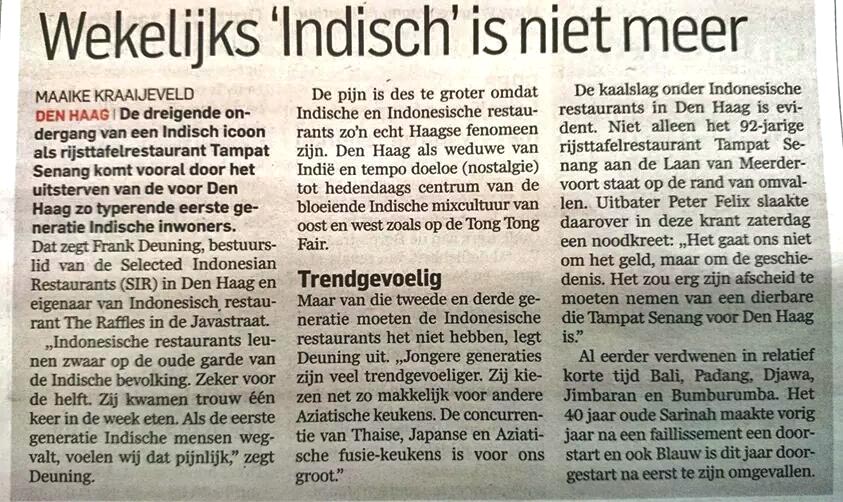 Tja … in het artikel zegt de heer Frank Deuning, eigenaar van “The Raffles” in de Javastraat en bestuurslid van “Selected Indonesian Restaurants” (SIR) dat de “oude garde van de Indische bevolking”, zeker de helft daarvan, 1 x in de week kwam eten. “Nu die is weggevallen voelen wij dat pijnlijk”, zegt de heer Deuning. Ik neem aan dat hij met “wij” zichzelf bedoelt en de leden van zijn SIR.