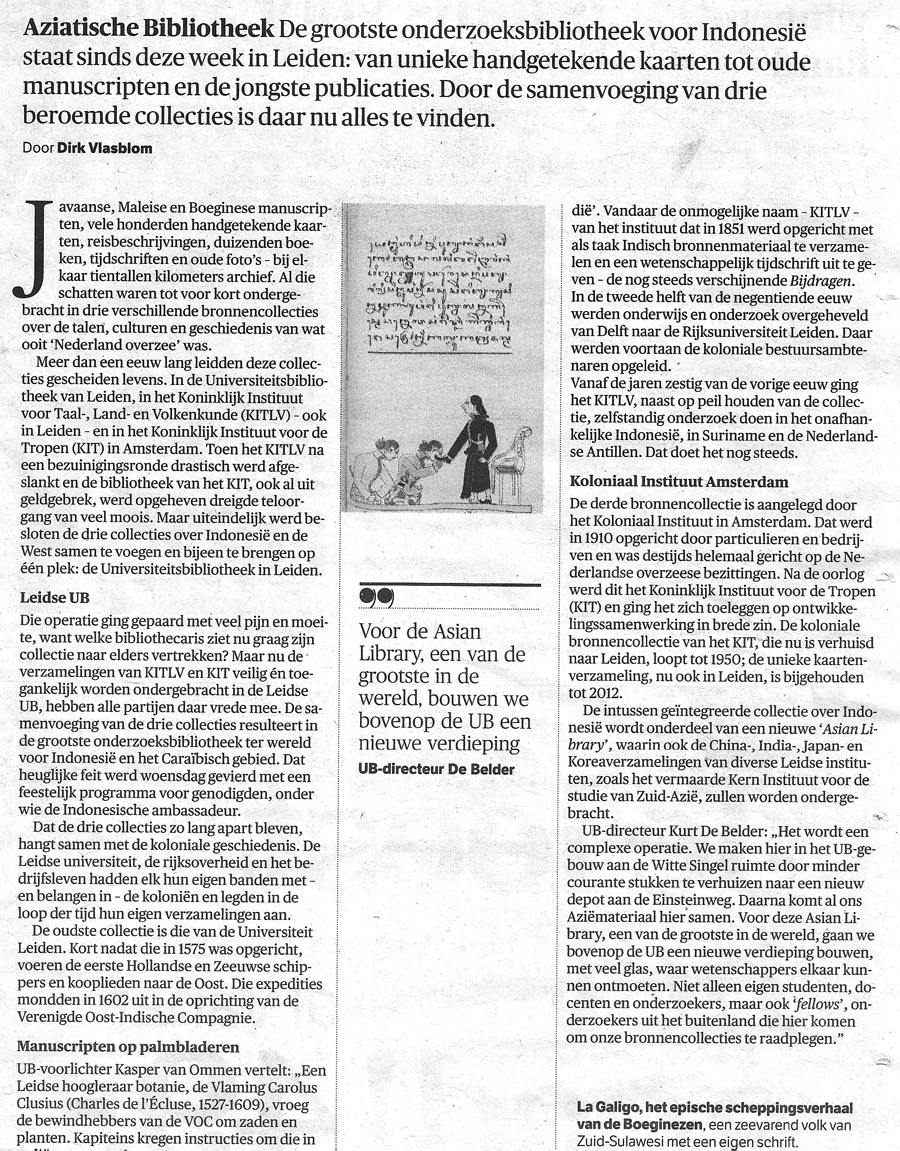 NRC 17 oktober : Aziatische Bibliotheek De grootste onderzoeksbibliotheek voor Indonesië staat sinds deze week in Leiden: van unieke handgetekende kaarten tot oude manuscripten en de jongste publicaties. Door de samenvoeging van drie beroemde collecties is daar nu alles te vinden.