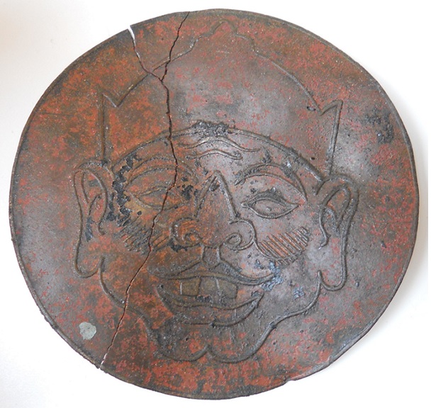 Een vondst die ik graag zou willen determineren is een grote ronde koperen schijf met daarop een gezicht/hoofd. De schijf is bijna 7 centimeter doorsnee. Opvallend zijn twee grote voortanden en ook de grote oren. Op het hoofd draagt de man een kroon of een muts. Aan de achterkant zitten een draadoogje en een soort houdertje, waardoor ik het idee heb dat het met een speld gedragen kon worden op kleding.